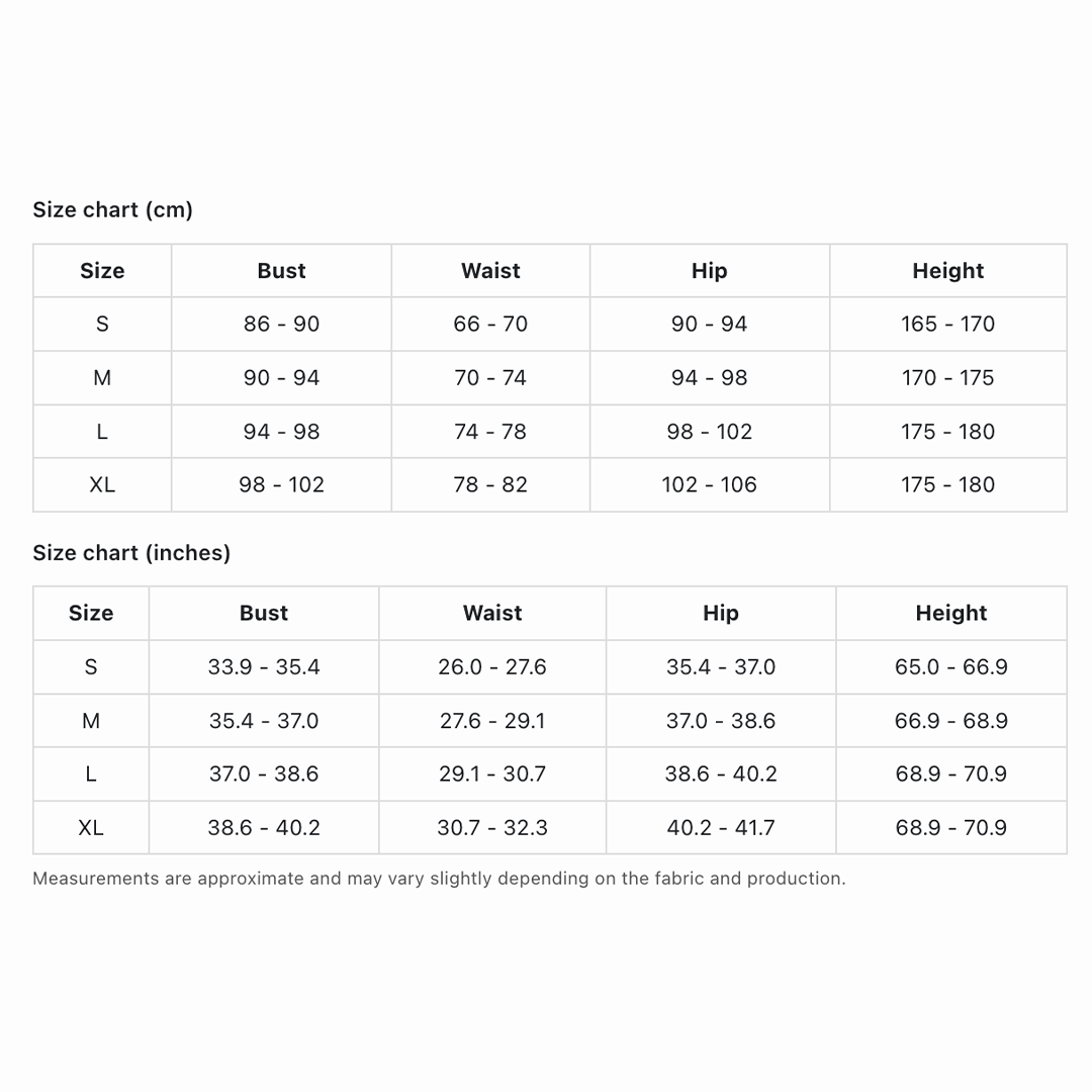 | Size | Bust | Waist | Hip | Height |