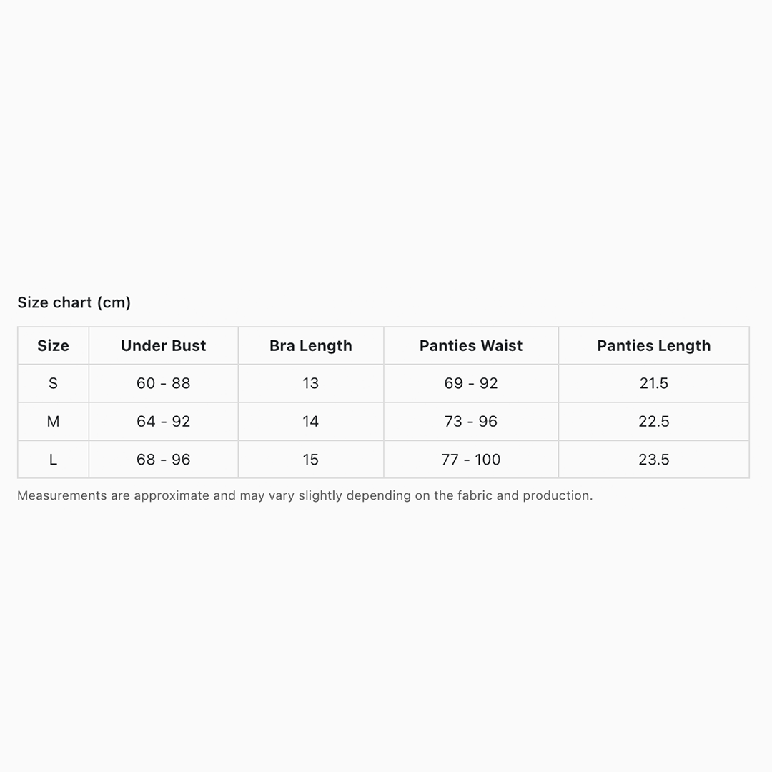 | Size | Under Bust | Bra Length | Panties Waist | Panties Length |